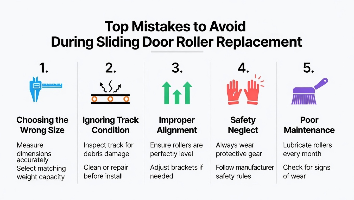| Rossz görgőméret | Az ajtó furcsán ül, nem záródik be, mégis húzódik | Átmérő/eltolás/terhelési érték eltérés | Igazítsa a görgő specifikációit az eredetihez; ellenőrizze a kerék átmérőjét és a ház mélységét |
